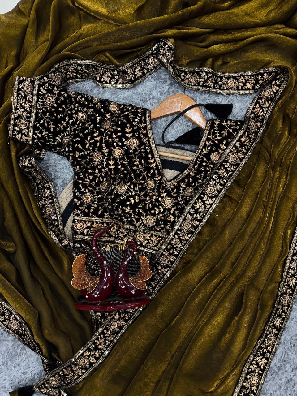 The Bollywood Celebrity Sequence Saree by Nice Creation features pure space silk with intricate sequins and zari embroidery. Adorned with a lace border and fancy latkan, it comes with a fully stitched viscose velvet blouse. Perfect for sangeet or cocktail parties, this gold silk saree radiates elegance and style.